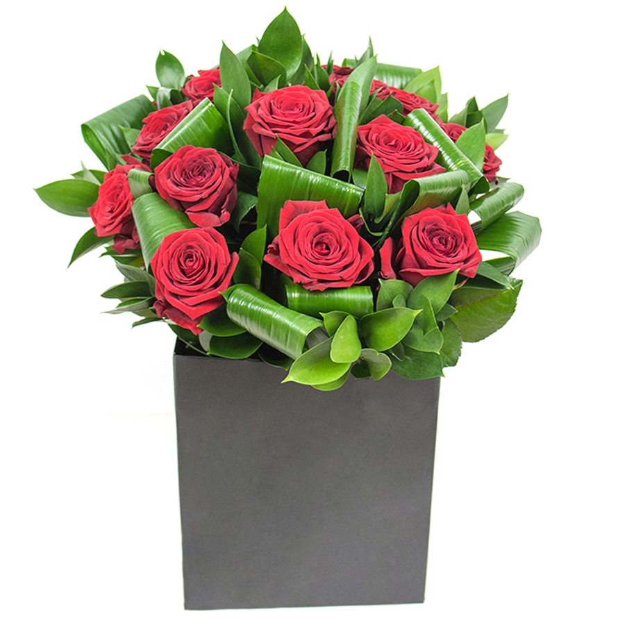 Immerse yourself in the elegance of our signature bouquet featuring enchanting red roses, complemented by luxurious aspidistra leaves and delicate ruscus. This arrangement is carefully crafted to infuse any setting with warmth and sophistication. Every bloom is hand-selected with precision to ensure the highest level of freshness and quality.